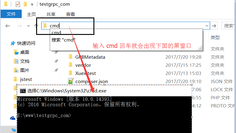 1.进入到项目的目录,如:E:\www\testgrpc_com 中在地址栏输入cmd回车即可