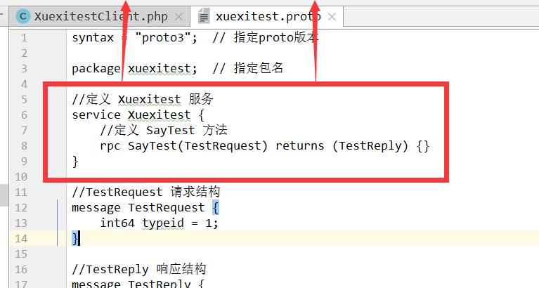 // (\Xuexitest\TestReply) 是响应信息(那个类),基本和 proto 文件定义一样